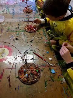Some Year 1 children are creating Autumn Trees. They are using Autumn colours of yellow, red and orange for the base surrounding their trees and have used wire and copper wire to sculpt their trees. Students today used air-dried clay to sculpt mushrooms to go underneath their trees. Next week I'll post the final pieces. Gauging the intense interest and concentration today, these mushrooms are going to be sensational!